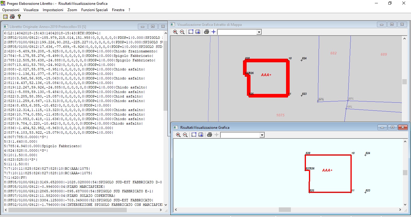 Nell’esempio della Fig.20 è mostrato il caso in cui viene interamente rilevato un contorno chiuso che rappresenta sia il confine della particella che del fabbricato. Nel Libretto delle Misure sono quindi necessarie due righe di tipo 7, la prima definisce il confine esterno della particella AAA ed è quindi senza suffisso mentre la seconda definisce il fabbricato annesso AAA+.