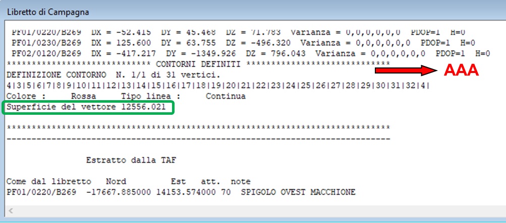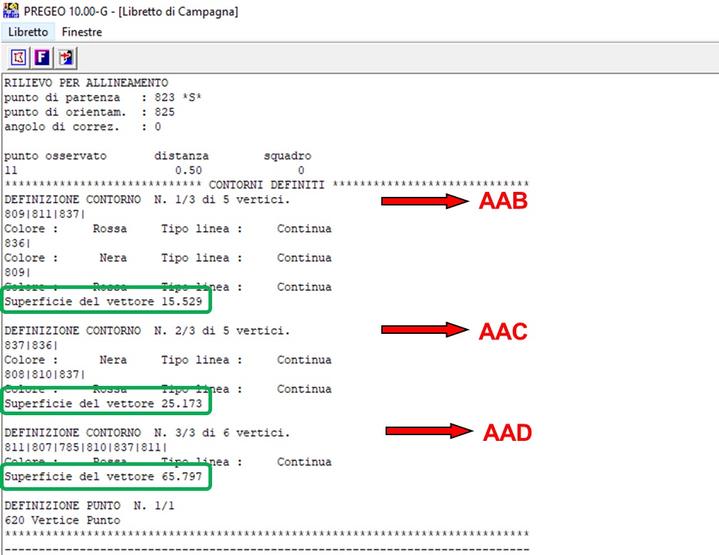 Nel Libretto delle Misure sono presenti diverse righe di tipo 7. La prima indica il lotto AAB, che è stato interamente rilevato e a cui sarà attribuita la superficie reale.