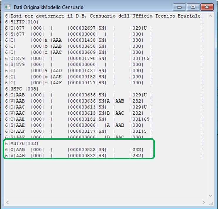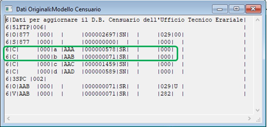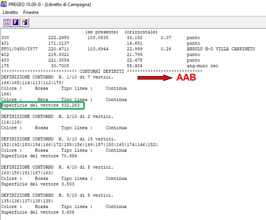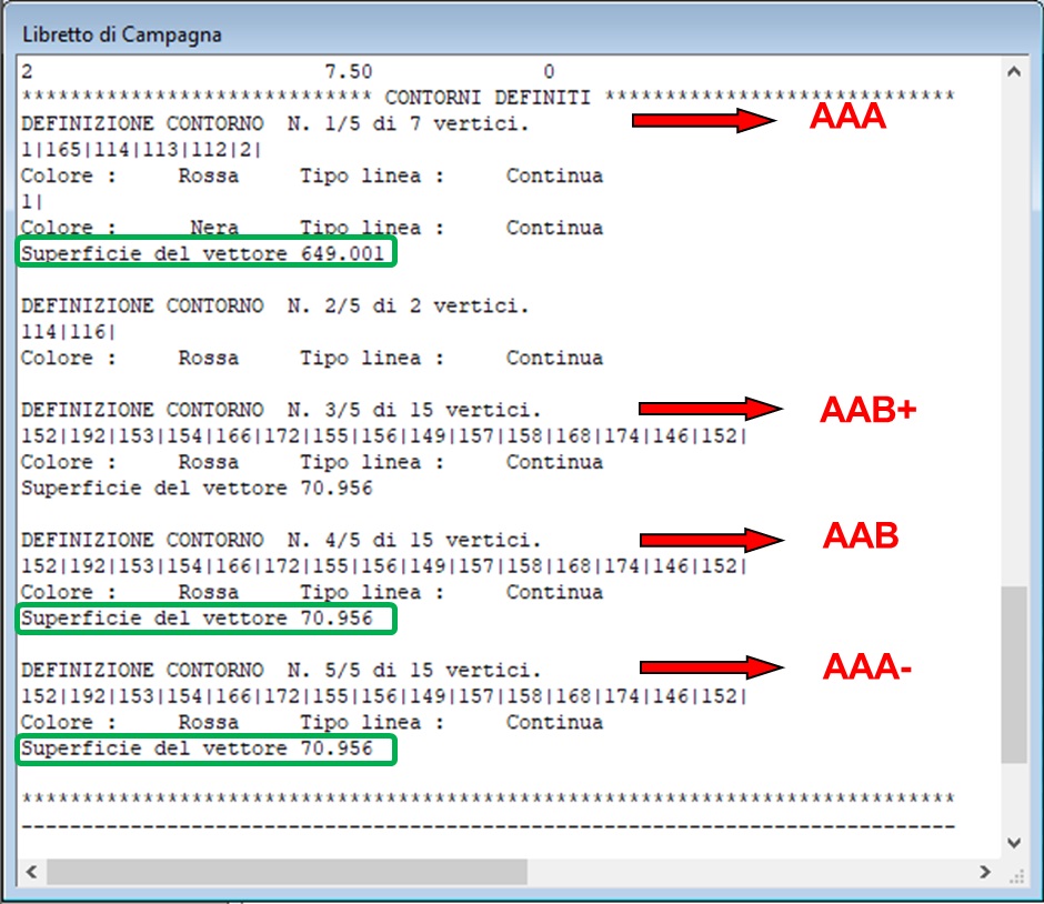 Le righe successive invece definiscono i contorni dei fabbricati: il suffisso + per i confini esterni (AAB+ e AAC+) e il suffisso +- per i confini interni (AAB+- e AAC+-).